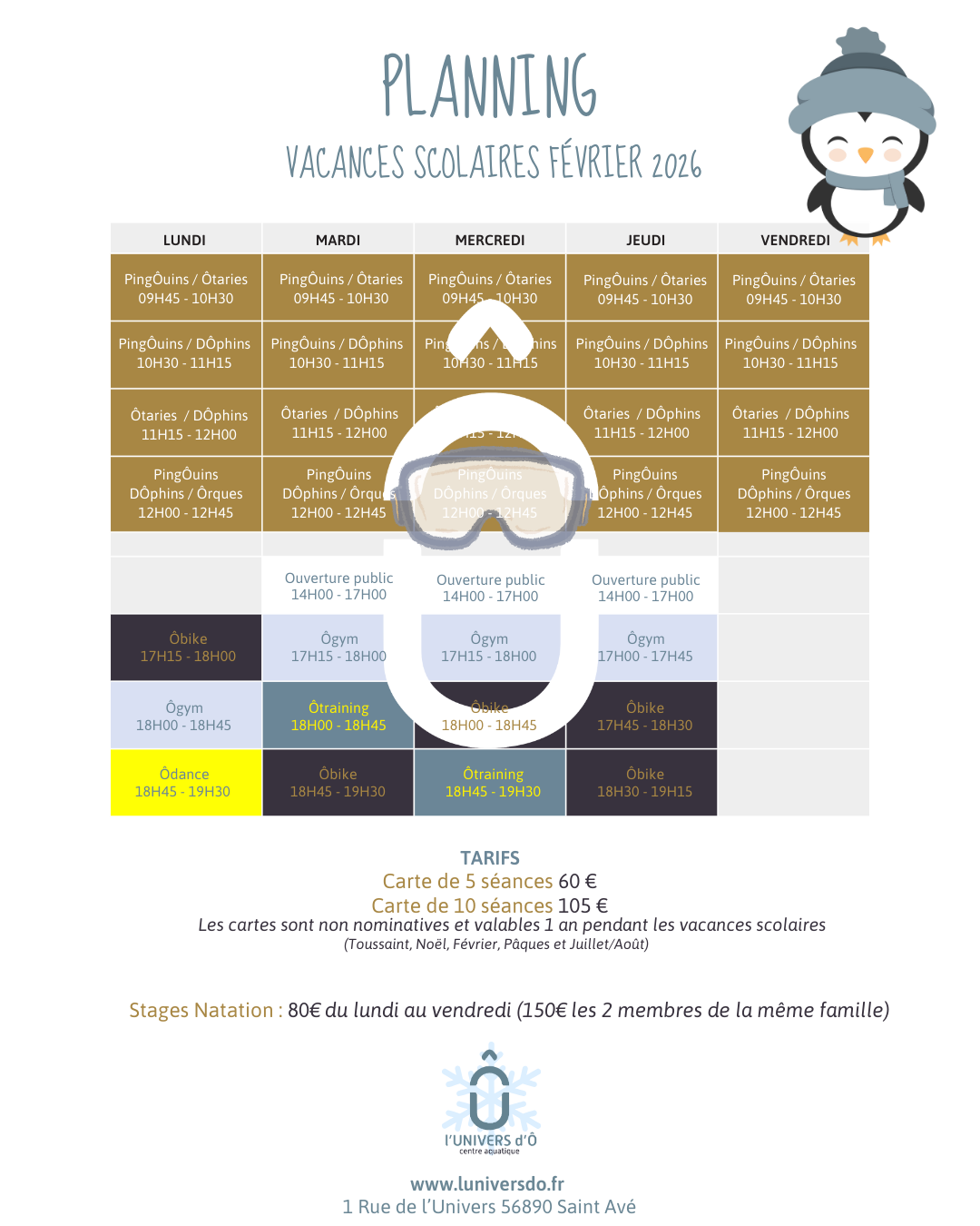 Nous vous accueillons dans notre centre aquatique à Saint-Avé. Vous pourrez pratiquer vos activités préférées dans l’eau. Notre bassin fait 12 mètres de long et 6 mètres de large avec une profondeur de 1,30 mètres d’eau partout. L’eau est chauffée à 31 degrés toute l’année.